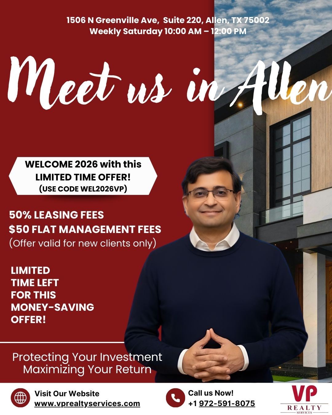 Kick-start 2026 with exclusive savings on professional real estate services from VP Realty Services in Allen, Texas. We are offering a limited-time special deal for new clients designed to help property owners maximize returns while reducing management costs.