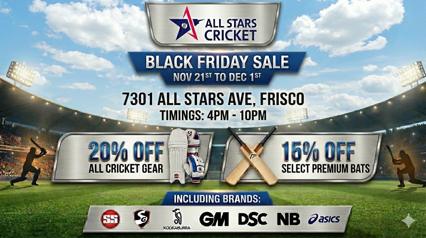 Experience the biggest Black Friday savings at All Stars Cricket, your trusted cricket store in Frisco, Texas. From November 21st to December 1st, customers can enjoy unbeatable discounts on top cricket gear and premium equipment. Get 20% off on all cricket gear and 15% off on select premium bats, just in time for the holiday season.