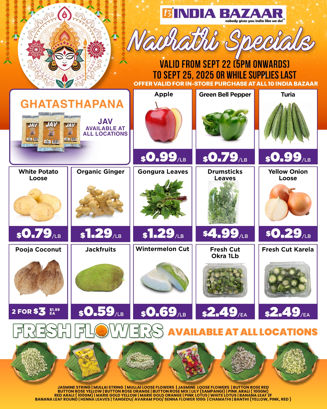 India Bazaar is bringing you exciting Navratri Specials 2025 across all 10 locations! From September 22 (5 PM onwards) to September 25, enjoy unbeatable savings on fresh produce, puja essentials, and festive flowers.
