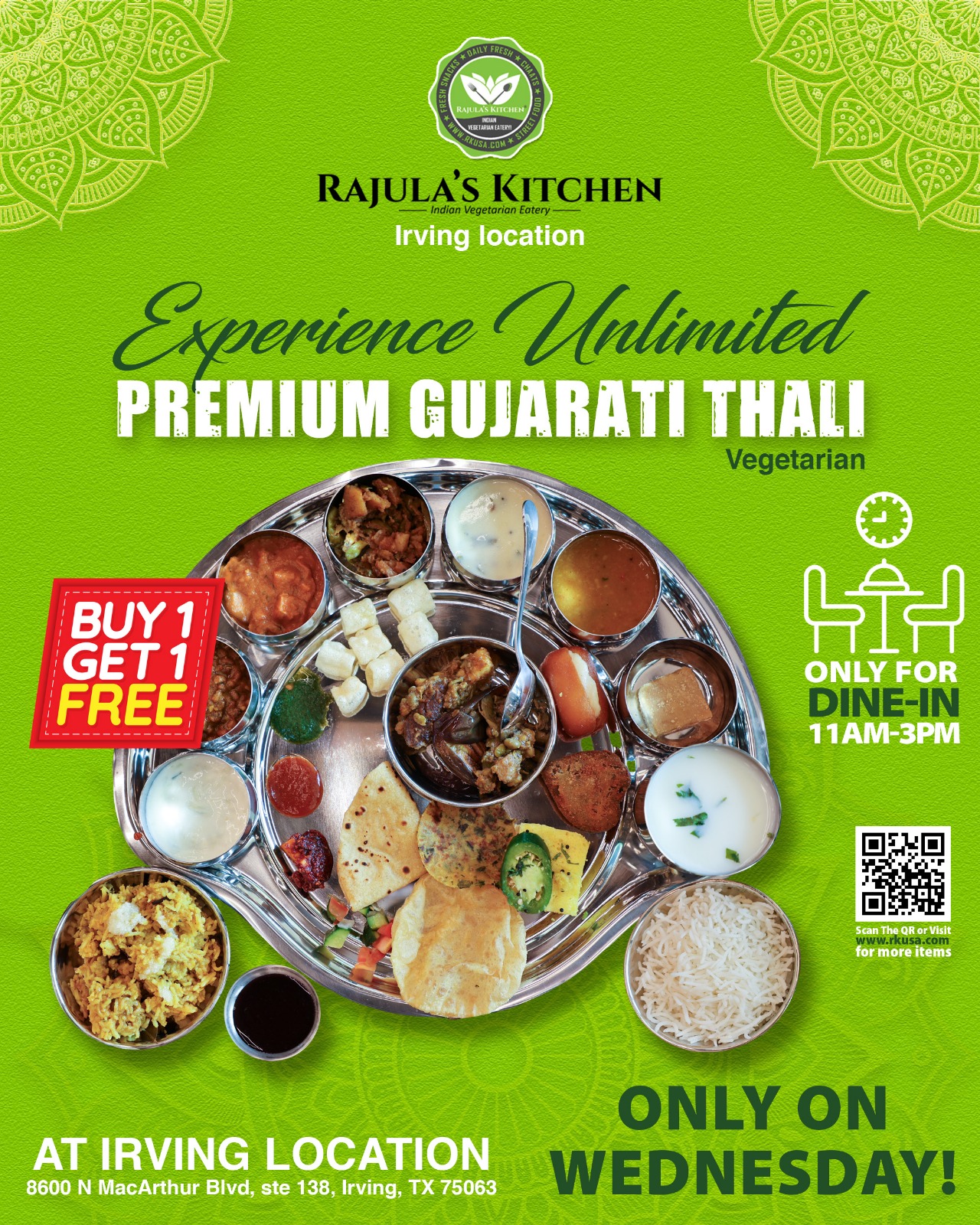 Rajula’s Kitchen Irving - Unlimited Premium Gujarati Thali, Buy 1 Get 1 Free Every Wednesday