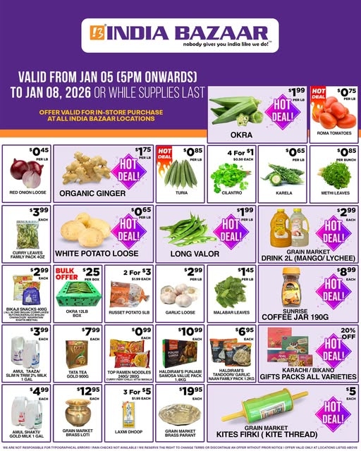 India Bazaar brings you hot grocery deals and bulk savings across all its locations for a limited time. Stock up on everyday essentials, fresh produce, pantry staples, and household grocery needs at unbeatable prices.