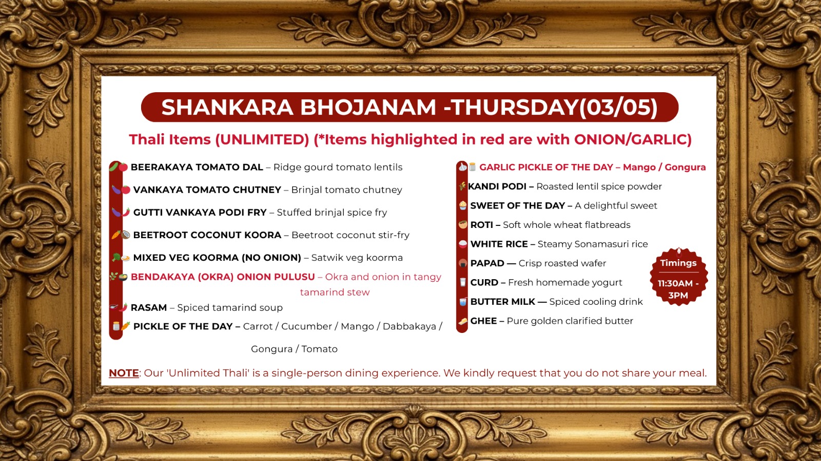 Experience the traditional taste of South Indian Bhojanam with the Unlimited Thursday Thali at Shankara Vilas in Plano, Texas. This special thali offers a complete authentic Indian dining experience with a variety of freshly prepared vegetarian dishes served with unlimited portions.