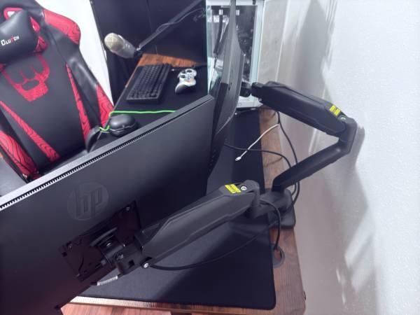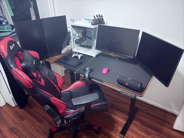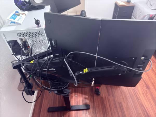 Comes with everything in the pictures EXCEPT the desk Specs are as follows: Blue yeti microphone with arm three 75hz HP monitors one Acer 180hz Monitor two Dual monitor arms (total of 4 monitors)