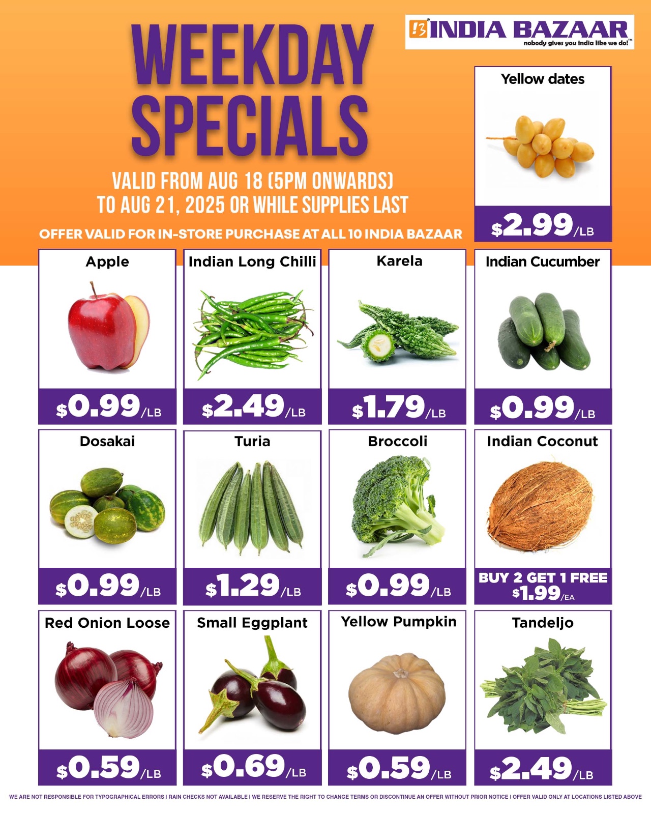 Explore exciting weekday specials at India Bazaar! Starting from August 18, 2025, at 5 PM onwards, enjoy unbeatable prices on a wide variety of fresh produce, including apples, cucumbers, turmeric, and many more.