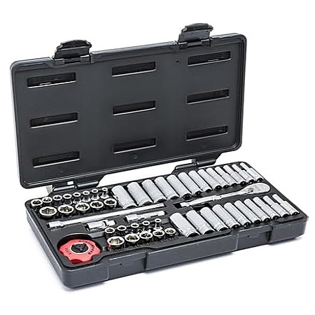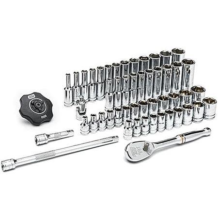 3/16-to-9/16-inch standard and deep sockets; 4-, 5.5-, 6-, and 5-mm standard and deep sockets; 1/4-inch drive full polished teardrop ratchet; 1/4-inch drive thumb wheel ratchet; 2-inch and 6-inch extension and universal joints, and blow-molded case.