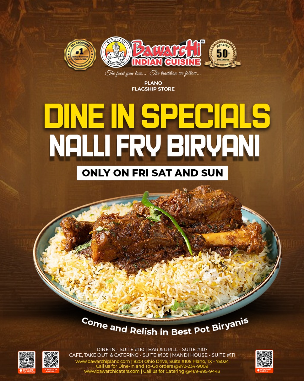 Experience the royal taste of our signature Nalli Fry Biryani – a rich, flavorful pot biryani crafted with tender lamb shank (nalli), slow-cooked to perfection in aromatic spices, and layered with fragrant basmati rice. This weekend-exclusive dine-in special is a must-try for true biryani lovers.
