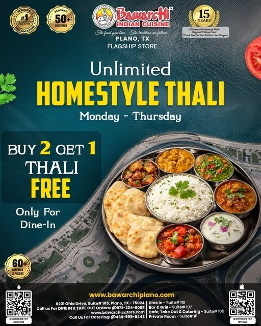 Bawarchi Indian Cuisine – Unlimited Homestyle Thali Buy 2 Get 1