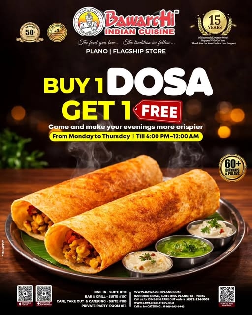 Bawarchi Indian Cuisine – Buy 1 Dosa Get 1 Free Deal at Plano Flagship Store | Dine-In Special