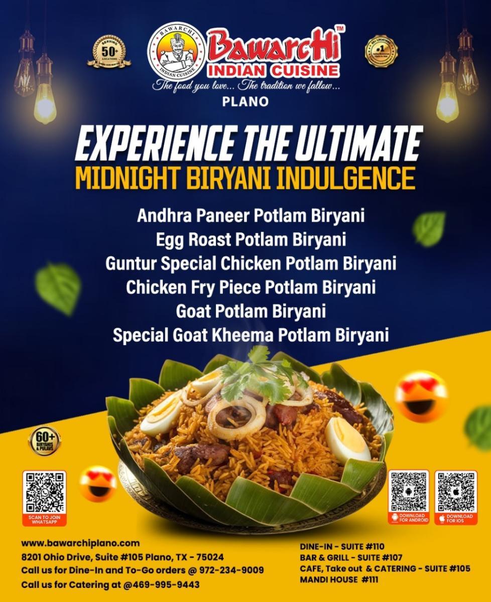 Craving something delicious late at night? Bawarchi Indian Cuisine invites you to experience the ultimate Midnight Biryani Indulgence with our mouth-watering Potlam Biryani specials: