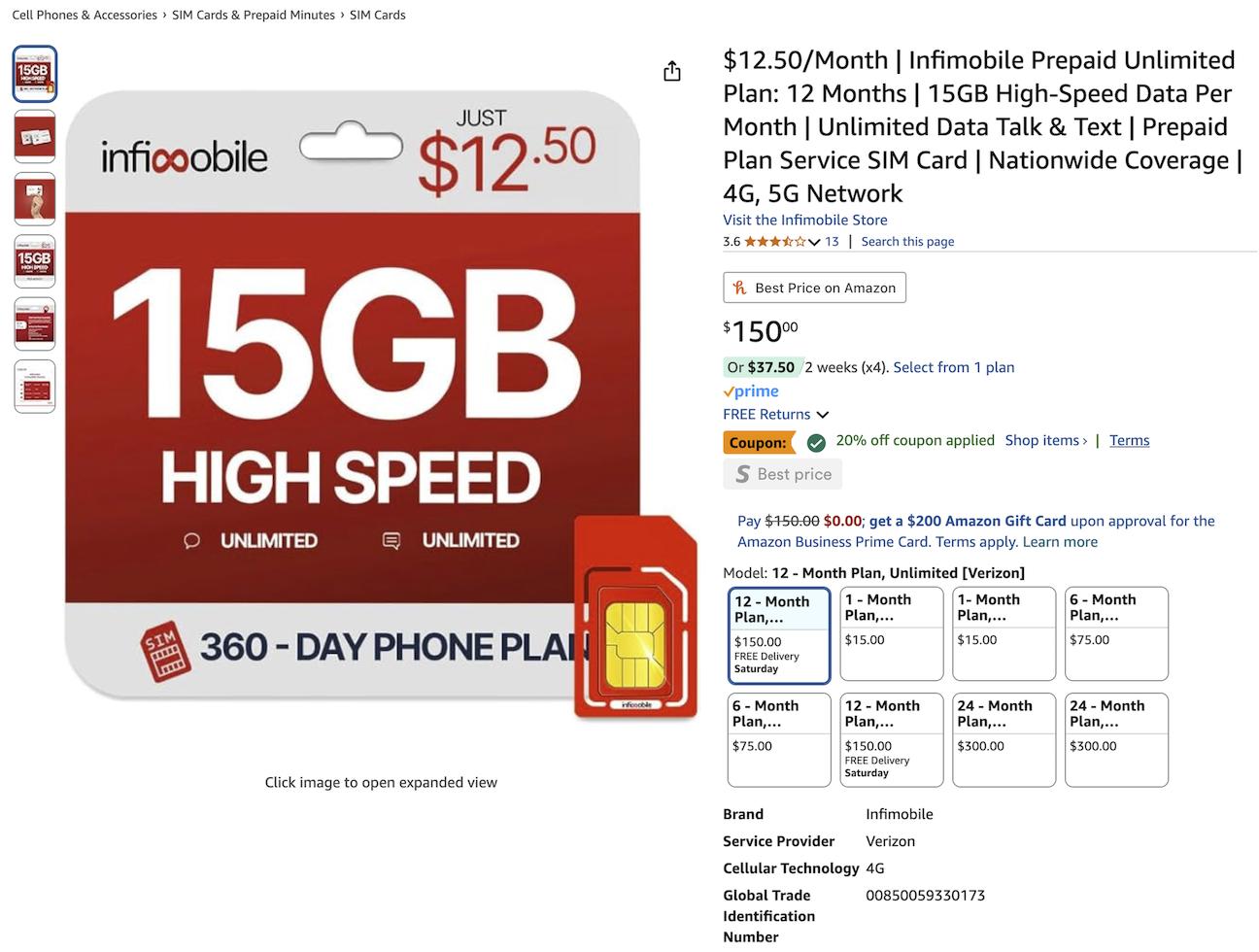 $12.50/Month | Infimobile Prepaid Unlimited Plan: 12 Months | 15GB High-Speed Data Per Month | Unlimited Data Talk & Text | Prepaid Plan Service SIM Card | Nationwide Coverage $120