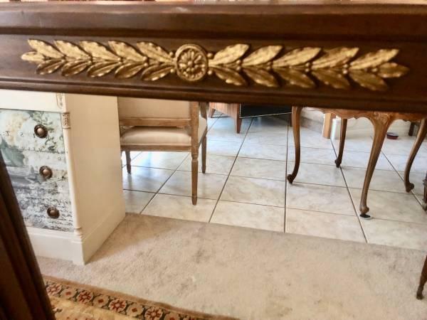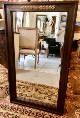 Extra nice heavy vintage mirror about 60 years old of mahogany with simple golden embellishment at the top. This mirror is beautiful in its simplicity, so I will keep the description short: measures 24.75 inches wide by 43 inches tall - perfect condition!