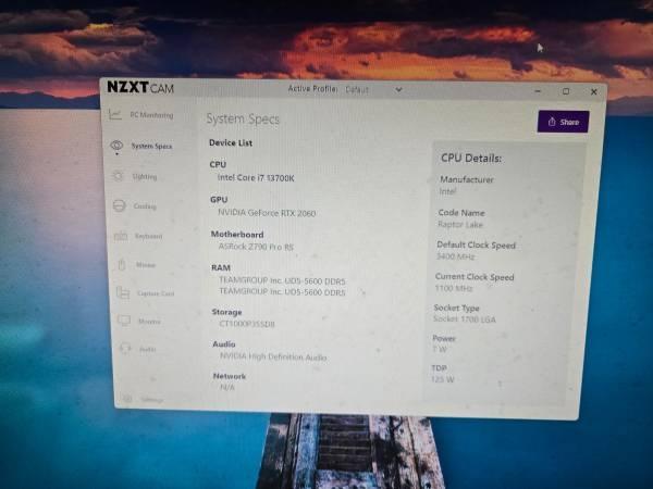 Case: Lian li O11 Mini Motherboard: Asrock Z790 Pro RS GPU: EVGA 2060 RAM: TForce 32 gig DDR5 5600mhz CPU: i7 13700k 3.4 ghz Storage: 1TB Crucial M.2 SSD OS: Windows 11 AIO: NZXT Kraken Z53 LCD Screen Fans: 9 Lian Li UNI SL120 Case Fans PSU: Lian Li 850 watt Monitor: Asus 24 in 144hz