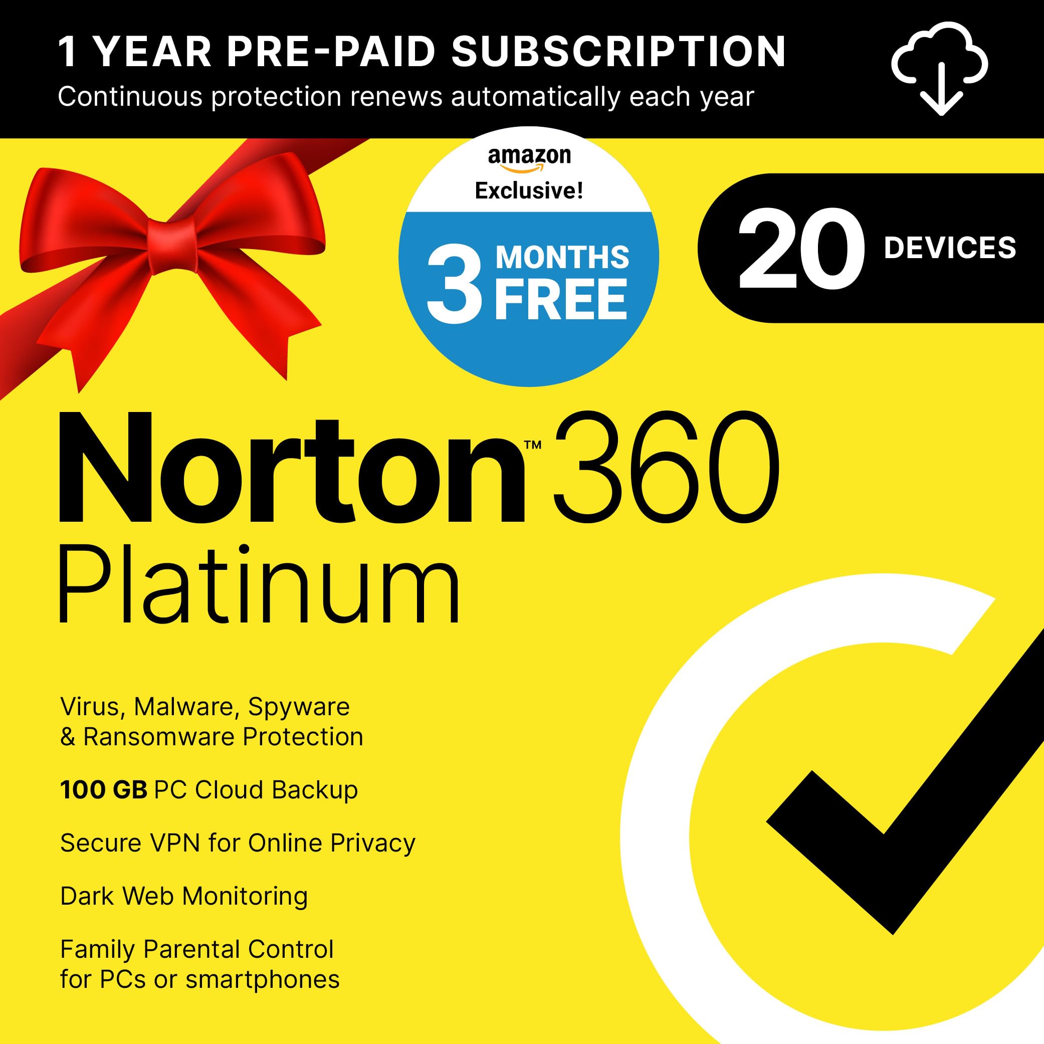 Norton 360 Platinum 2025, Antivirus software for 20 Devices with Auto Renewal - 3 Months FREE - Includes VPN, PC Cloud Backup & Dark Web Monitoring [Download] $21.09