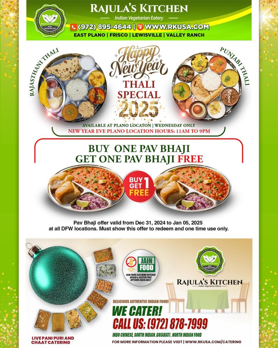 Celebrate the New Year with authentic Indian vegetarian delights at Rajula's Kitchen! Enjoy these amazing offers: