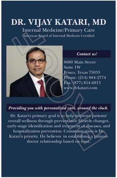 Dr. Vijay Katari, MD is a board-certified Internal Medicine and Primary Care physician dedicated to providing personalized healthcare in Frisco, Texas. With a strong focus on preventive lifestyle approaches, early disease detection, and effective long-term wellness planning, he builds trusted physician-patient relationships through communication, compassion, and continuous care. Dr. Katari strives to enhance overall patient health while helping reduce hospitalization through proactive medical management.